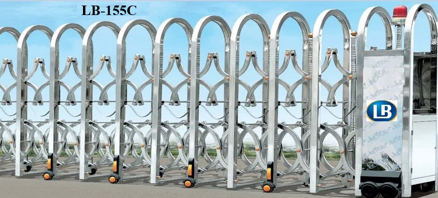 Tên gọi: Cổng xếp inox Kiểu mở: Remote (thiết bị điều khiển từ xa); Màu sắc: Trắng tự nhiên của inox